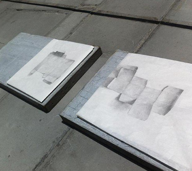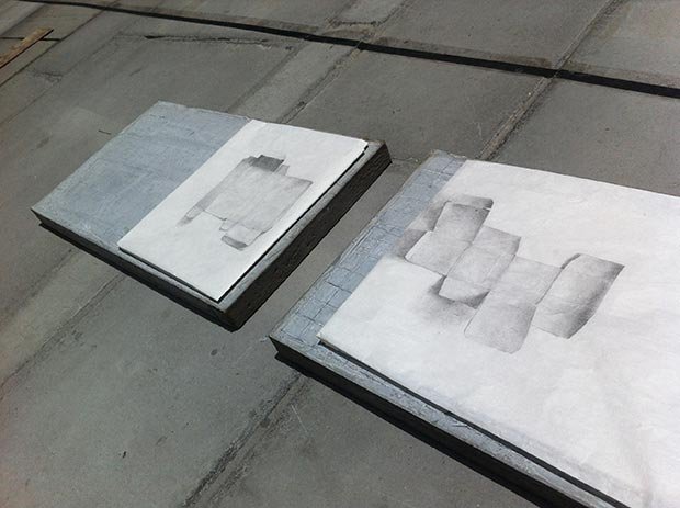 a series of graphite drawing on rice paper, mounted on cement plaques